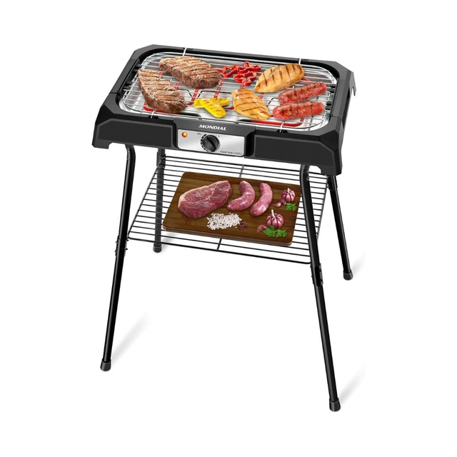 A Churrasqueira Elétrica Grand Steak & Grill II Mondial CH-06 é perfeita para quem adora churrasco, mas tem pouco espaço, pois é compacta e não faz fumaça Ótima para apartamentos e ambientes fechados, acompanha pedestal desmontável e prateleira, para auxiliar nos preparos. Grelha carnes, frangos, espetos e muito mais, graças à sua alta potência e ao controle de temperatura. Uma churrasqueira desenvolvida para você e sua família desfrutar de alimentos mais saudáveis e saborosos. Conta com controle de temperatura, suporte com prateleira de apoio, alças antitérmicas, altura da grelha ajustável, grelha e bandeja removível para facilitar na hora da limpeza. Vem com bandeja que permite colocar água e evita que as partículas de gordura se queimem e libere fumaça, lâmpada-piloto indicando o funcionamento do aparelho.