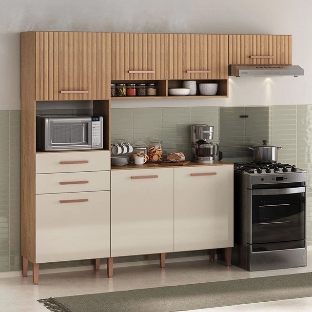 A Cozinha Completa Fortaleza 7 Portas 2 Gavetas Ripado 3d Canelato Rustico/Natura/Off White - Atualle Móveis é produzido em mdf e mdp na escala de brilho Brilho, e possui um grau de dificuldade de montagem: Médio.