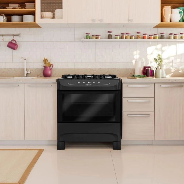 Fogão Mueller preto fosco 5 Bocas mesa de vidro