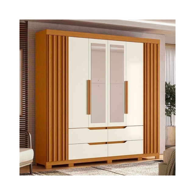 Esse guarda roupa casal grande foi projetado com as portas laterais com detalhe ripado, que adicionam um toque de charme e estilo ao ambiente. Já as 04 gavetas espaçosas possuem puxadores estilo cava, proporcionando um visual moderno e sofisticado. Além disso, as corrediças telescópicas garantem um deslizamento suave e sem ruídos. Na parte interna, com os cabideiros em alumínio, você terá amplo espaço para pendurar suas roupas sem se preocupar com amassados, ao passo que as diversas prateleiras são uma ótima opção para roupas que podem dobrar ou até mesmo para dispor calçados, bolsas e até itens de maquiagem. Outro detalhe são os pés inclusos, que oferecem estabilidade e durabilidade ao móvel, além de facilitar a limpeza do ambiente. Para completar, o jogo de espelho é perfeito para você conferir seu visual antes de sair, além de contribuir para a sensação de profundidade no ambiente.