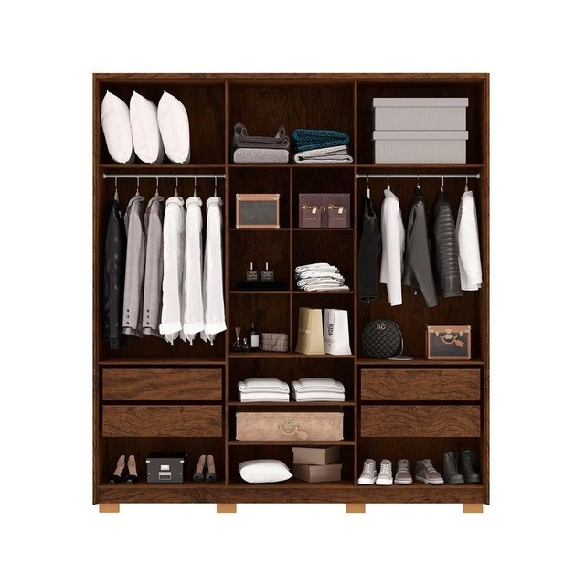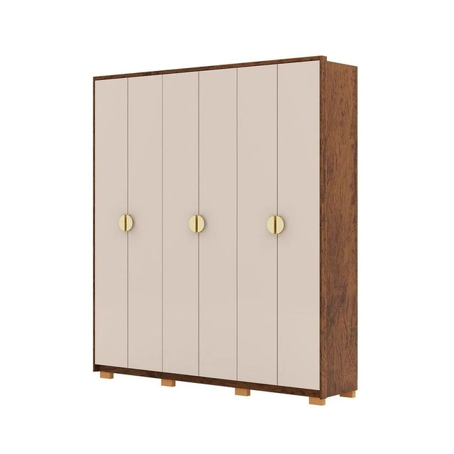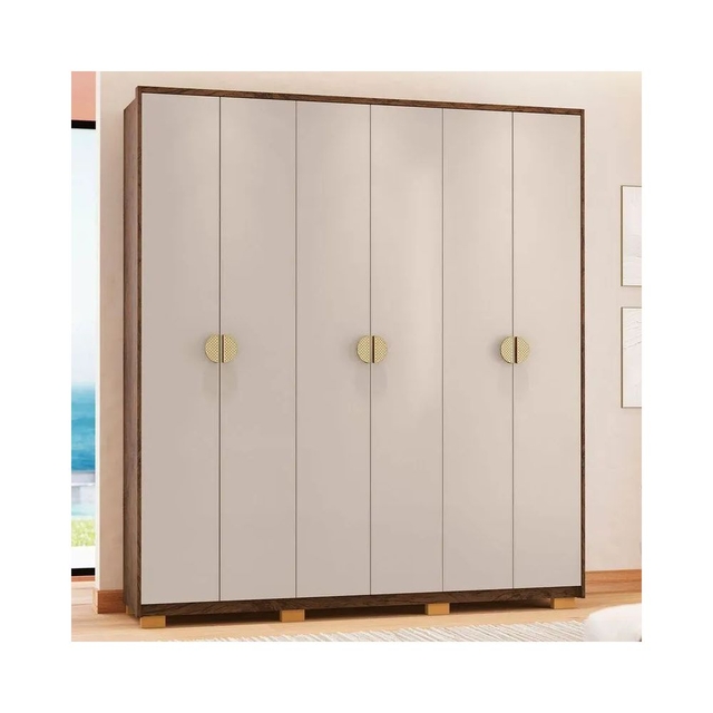 O Guarda-Roupa é a solução ideal para quem precisa de funcionalidade e estilo. São 6 portas dobradiças metálicas e uma estrutura 100% em MDF, garante resistência e durabilidade, sendo perfeito para o uso diário. A divisão interna do Guarda Roupa Casal é cuidadosamente planejada para facilitar a organização. Com quatro gavetas de abertura total, corrediças telescópicas, cabideiros em alumínio e prateleiras internas, ele oferece o melhor aproveitamento do espaço. O acabamento externo do Guarda-Roupa Noronha segue um estilo minimalista com linhas retas, que conferem um design elegante e moderno. Os puxadores em poliestireno meia concha, com a combinação da textura da telinha e acabamento dourado, adicionam um toque de sofisticação e memória afetiva ao ambiente. Além de sua funcionalidade e beleza, o guarda roupa conta com pés, ficando opcional o uso na montagem, permitindo uma personalização extra para se adaptar perfeitamente ao Quarto De Casal. Ideal para quem deseja unir design e praticidade em um só móvel.
